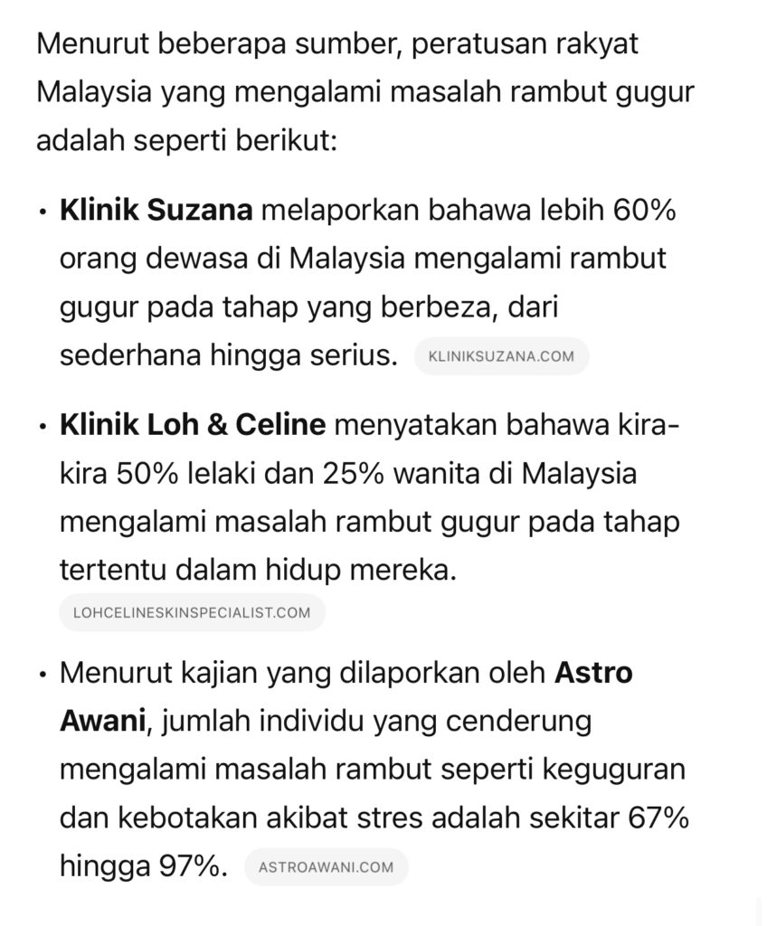 Di Malaysia ramai yang ada masalah Rambut 25%-60%